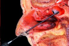 - Мобилизация хрящевой части перегородки носа в противоположную сторону, для чего В.И.Воячек предложил делать насечки (надломы) на хрящевой части перегородки носа, не разрезая надхрящницу и слизистую оболочку противоположной стороны; при необходимости расширения доступа к передней стенке клиновидной пазухи допустимо удаление только отдельных участков в хрящевом отделе, особенно искривленных и мешающих ортоградному доступу к клиновидной пазухи. В костном отделе перегородки носа удаляются только те участки, которые находятся на пути к роструму клиновидной пазухи. А.С.Киселев (1997) обращает особое внимание на необходимость сохранения в качестве срединного ориентира верхней части перпендикулярной пластинки решетчатой кости (нижняя часть удаляется для расширения доступа к роструму клиновидной пазухи).